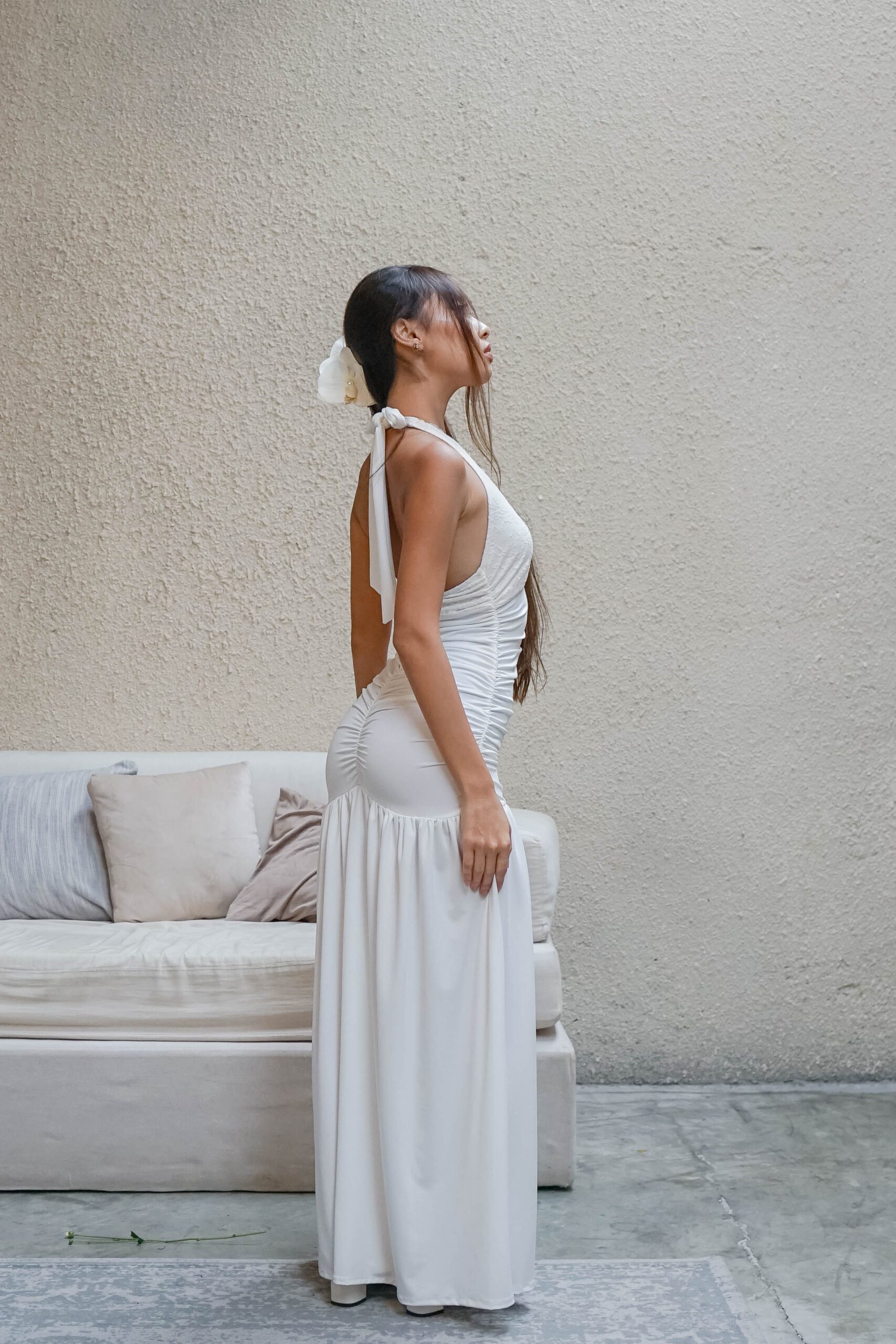 Louisa Long Dress is the ultimate choice for your special occasions. Every detail is thoughtfully designed, featuring a halter neckline with delicate lace edging, a scrunched bodice to accentuate your curves, and a flowing flared skirt for an ethereal, dreamy look. Crafted from high-quality nylon spandex, this dress offers both elegance and comfort. Available in three stunning colors: white, black, and brown.