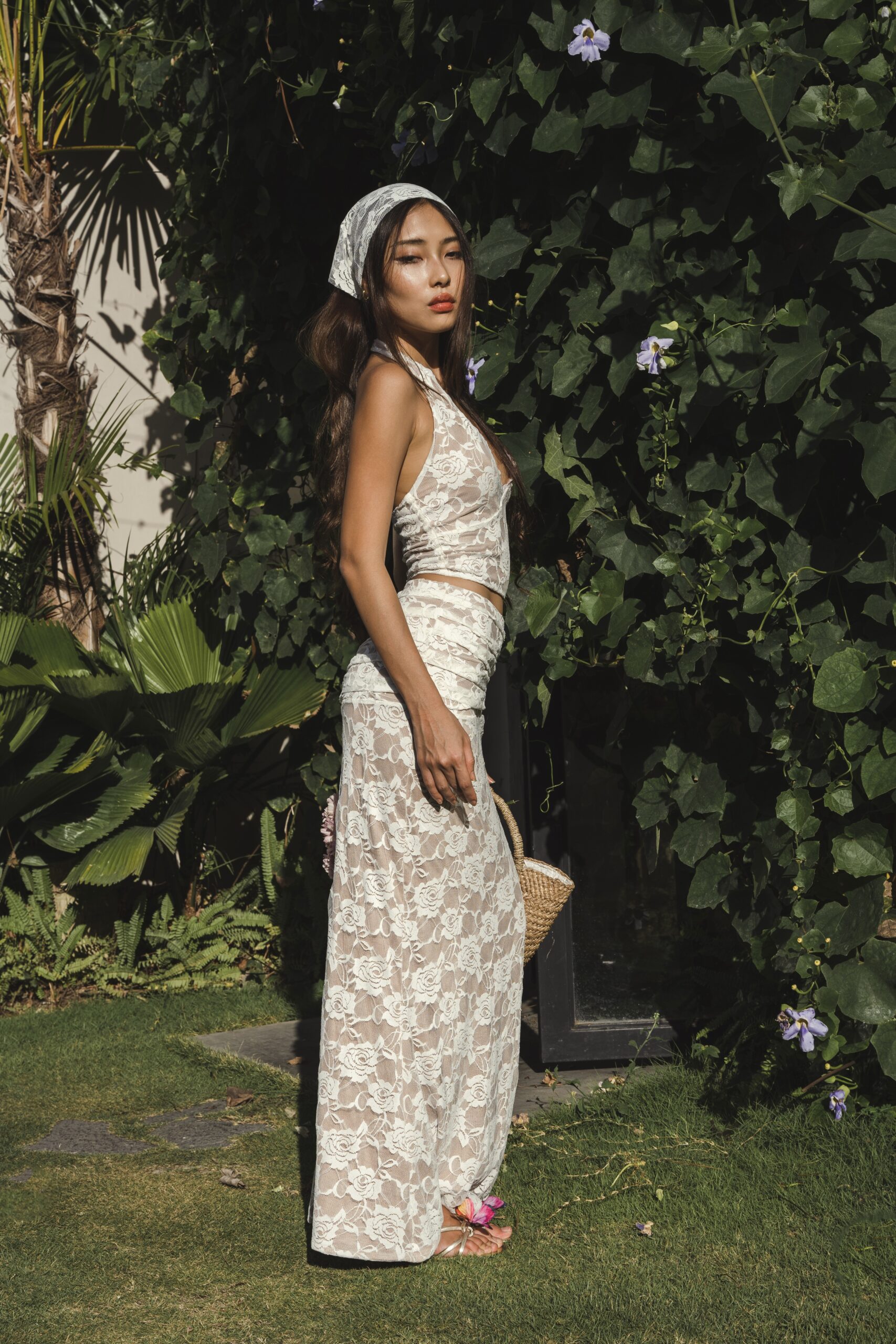 A mermaid-style long dress is designed for a flattering silhouette, Lyla lace skirt. Featuring stretchy lace designs and scrunched waist details. Available in two colors, black and white.
