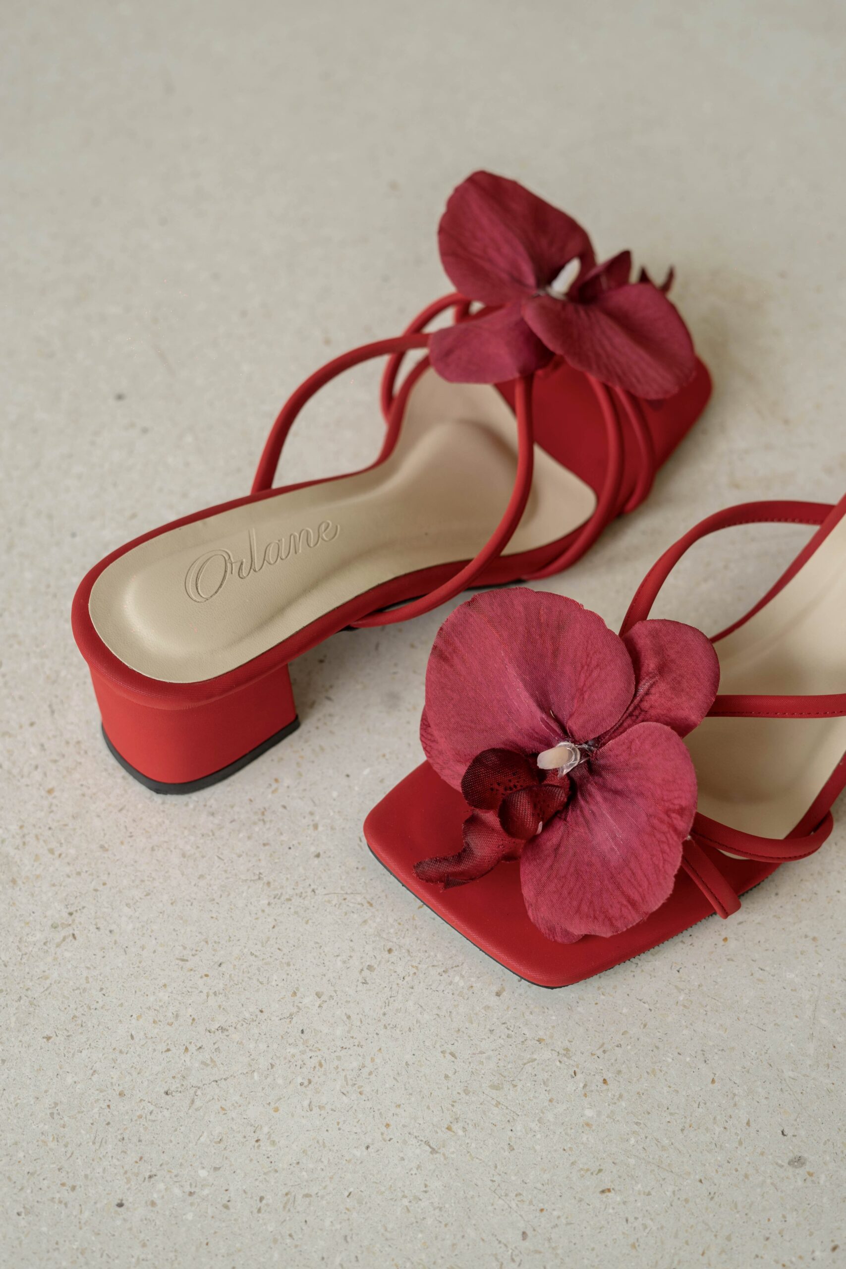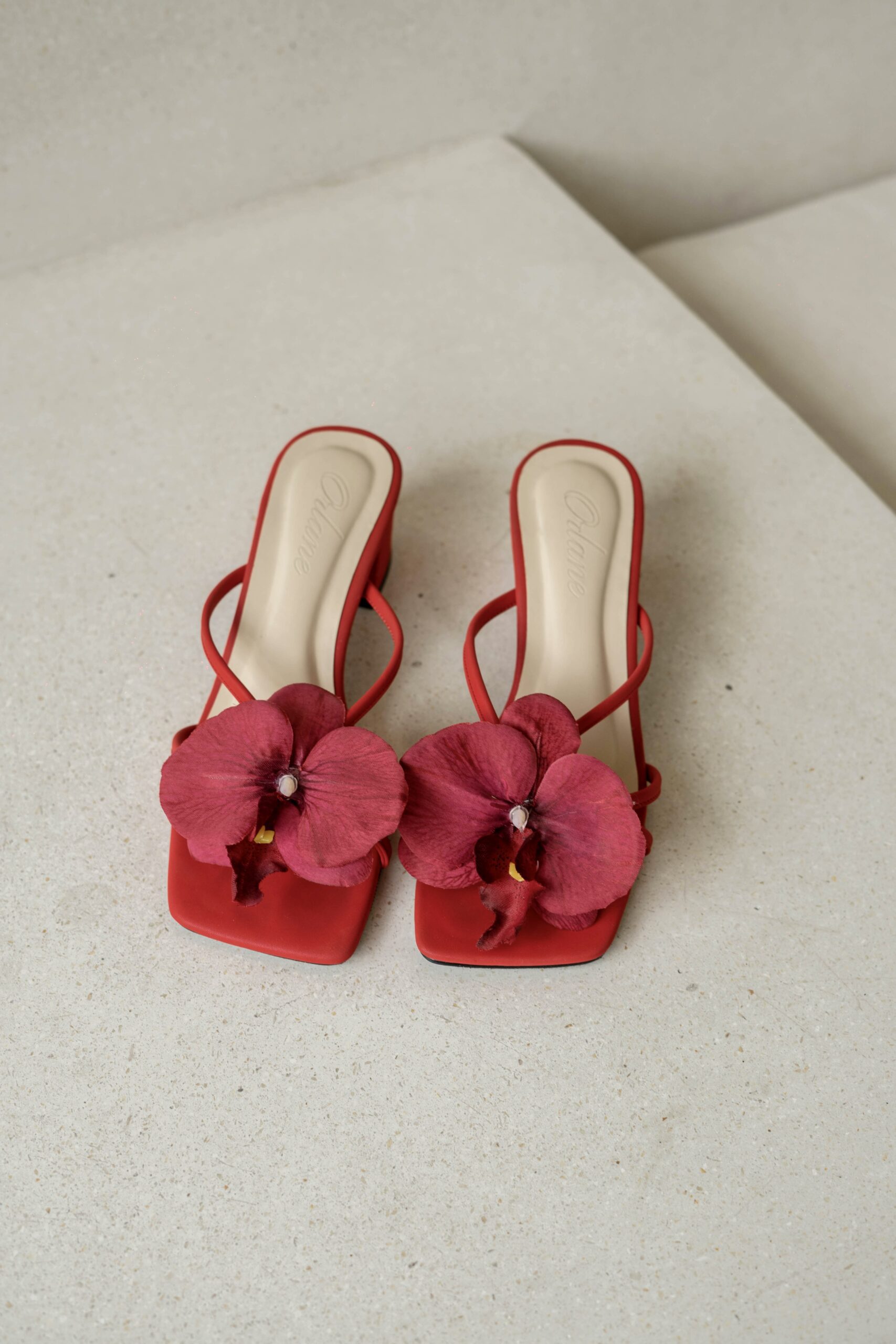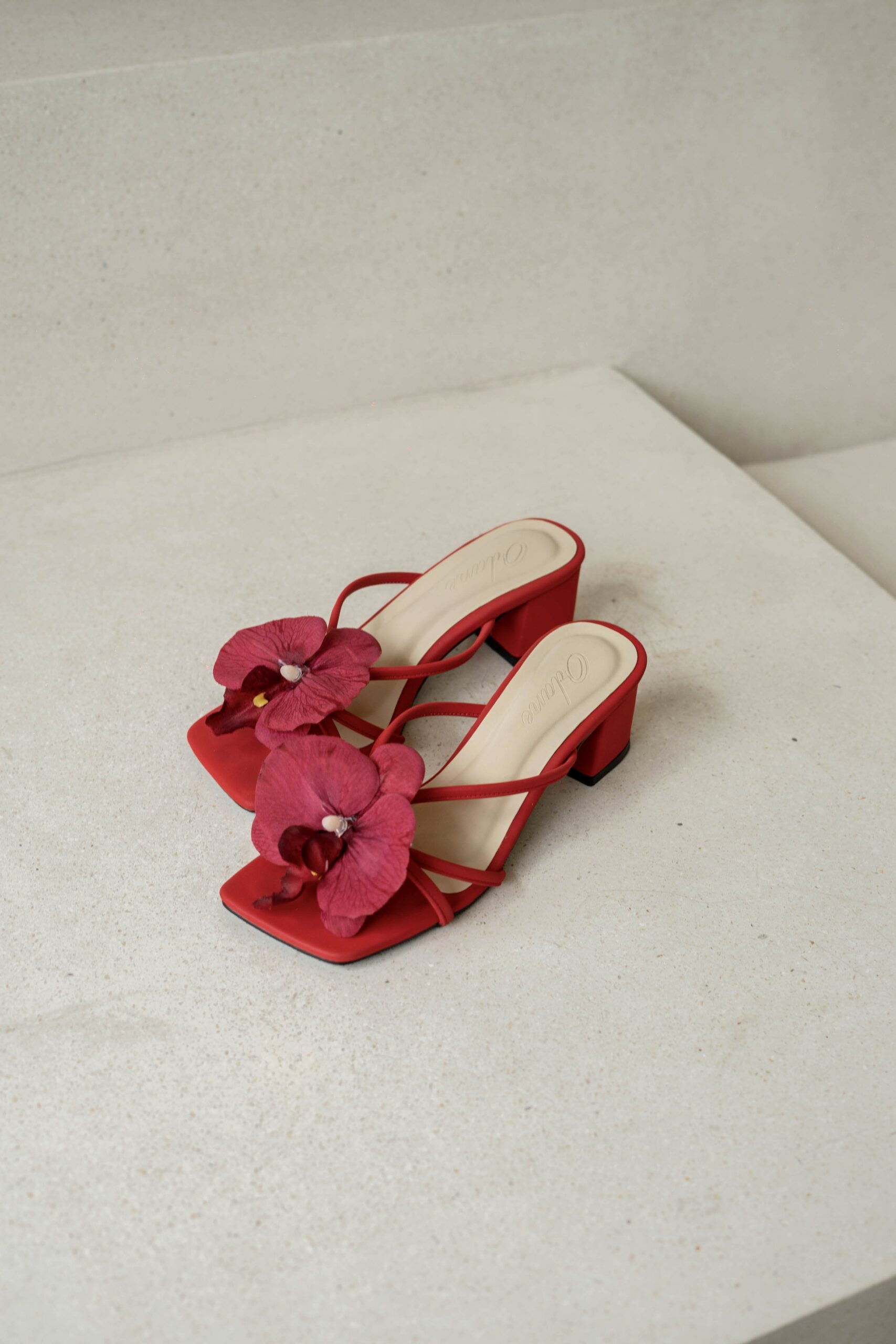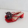 Camilla block heels are high-quality, handmade vintage summer shoes. With a 5 cm block heel and padded for extra comfort, they come in a red base color. Each pair is beautifully adorned with an attachable artificial red orchid flower, adding a perfect touch of flair. These distinctive details are designed to make you look both stylish and trendy!
