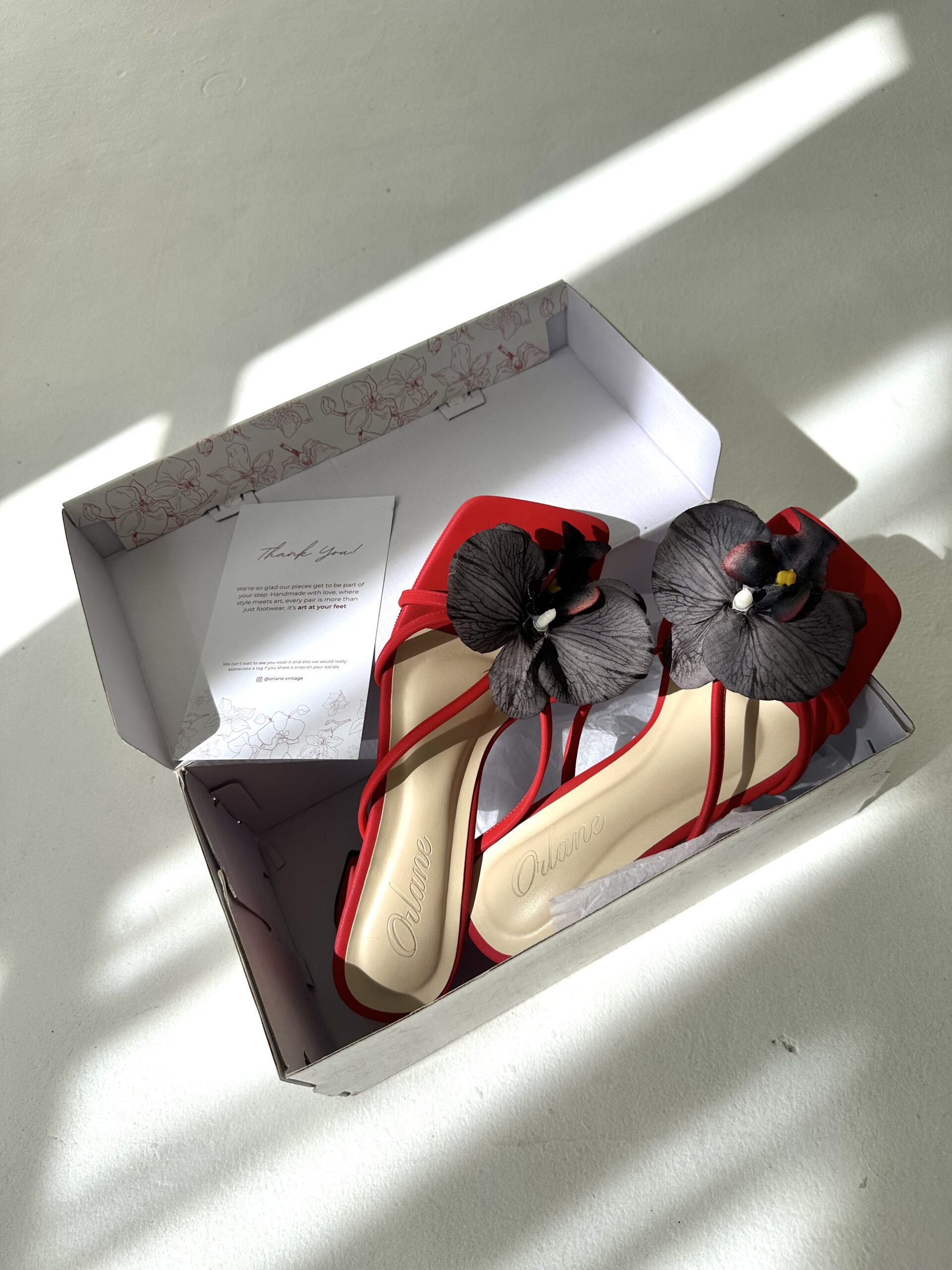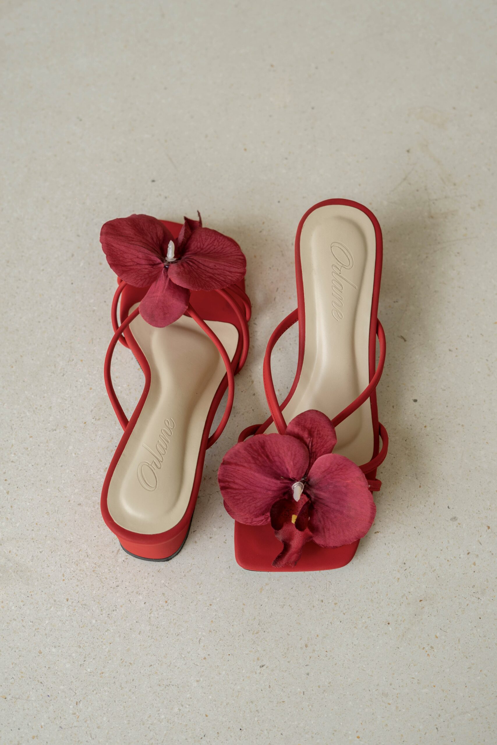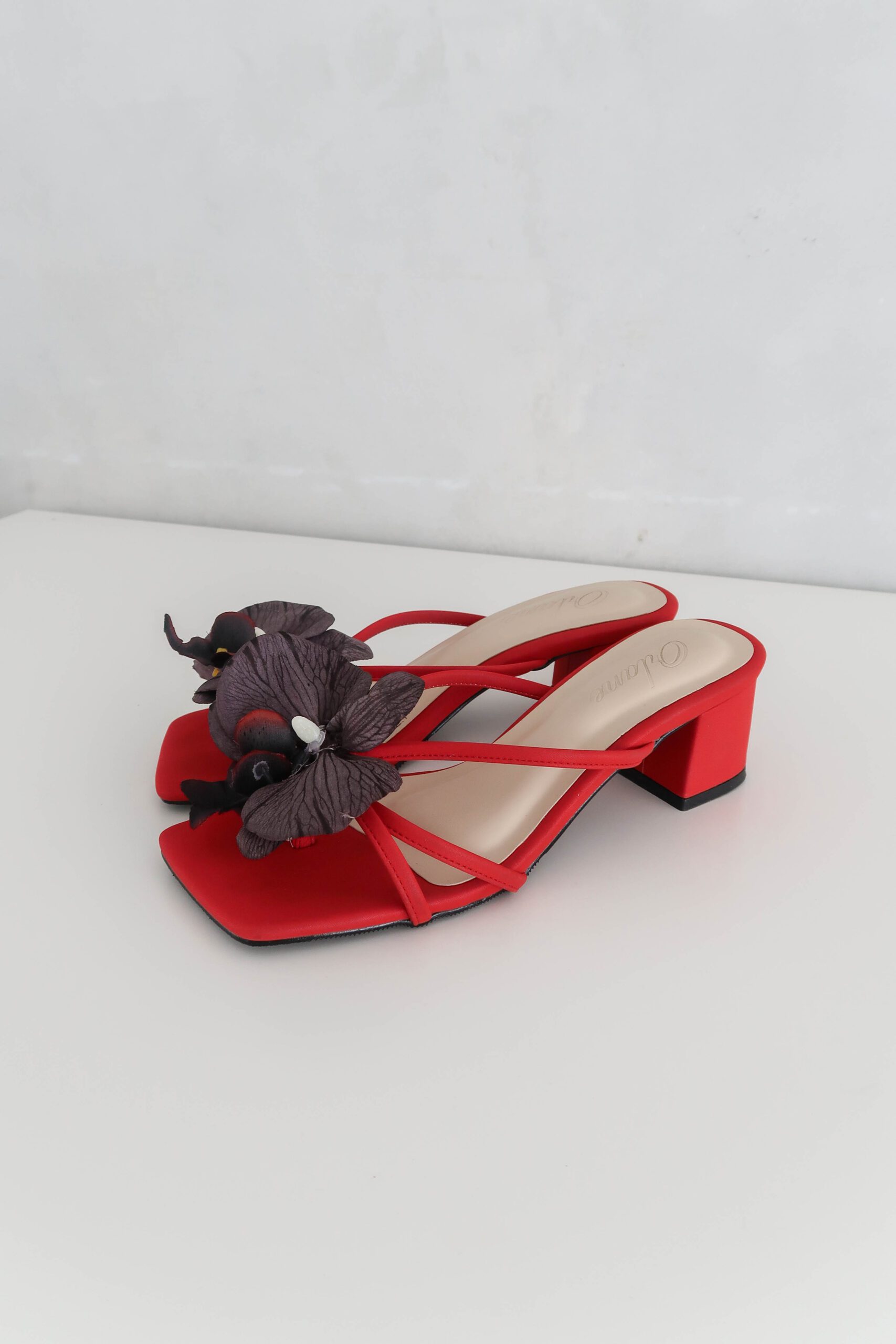 Camilla block heels are high-quality, handmade vintage summer shoes. With a 5 cm block heel and padded for extra comfort, they come in a red base color. Each pair is beautifully adorned with an attachable artificial red orchid flower, adding a perfect touch of flair. These distinctive details are designed to make you look both stylish and trendy!