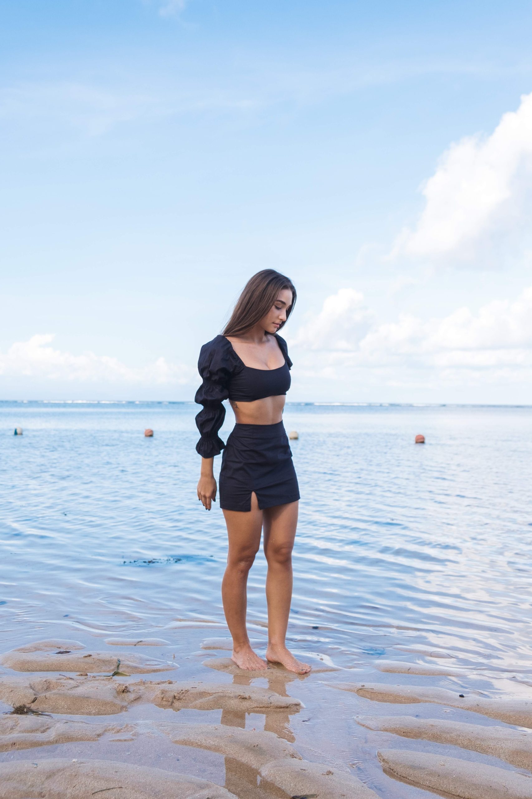 The set made from a high quality cotton poplin stretch. The top is a bandeau style featuring a straight neckline, contouring curved hem and elasticated puff sleeve detailing. The mini skirt is a high waisted style featuring an off centre split.